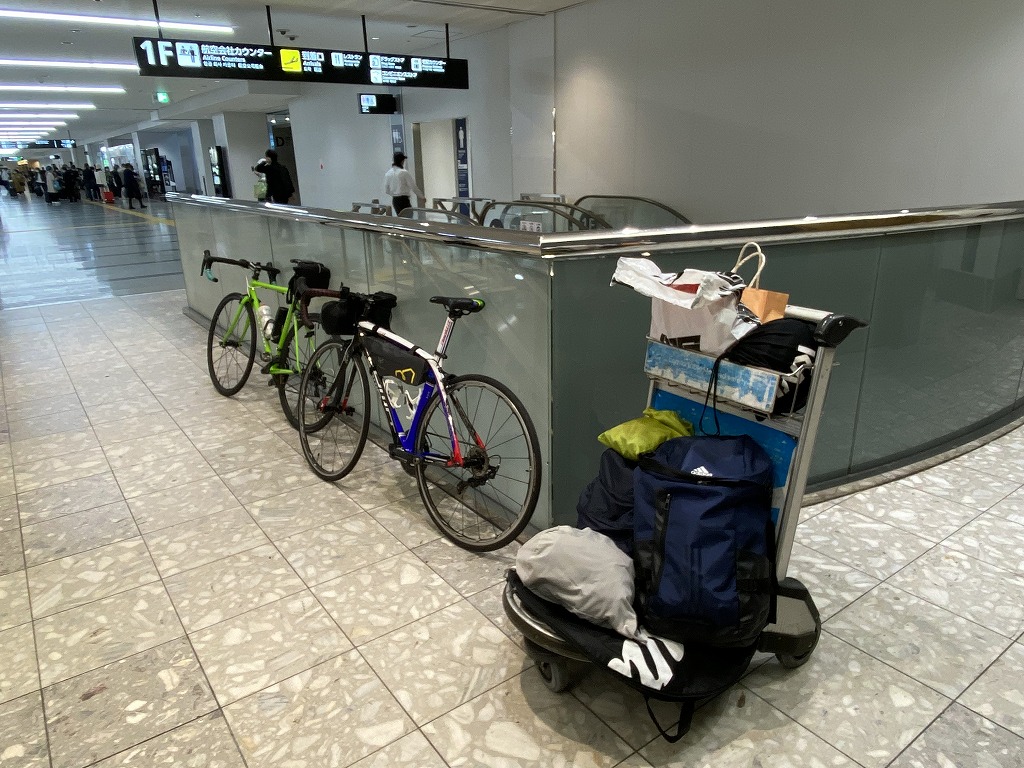 空港カウンターまで自転車を運び梱包する箱を受け取り自転車を分解して箱に詰め込みます。