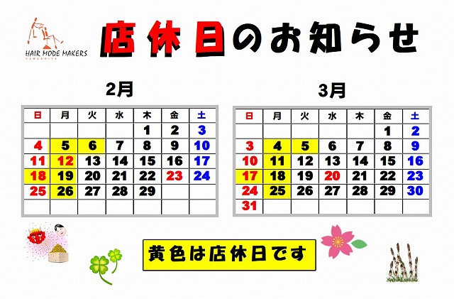 ヘアーモードメーカーズヤマシタの【2月の店休日のお知らせ】