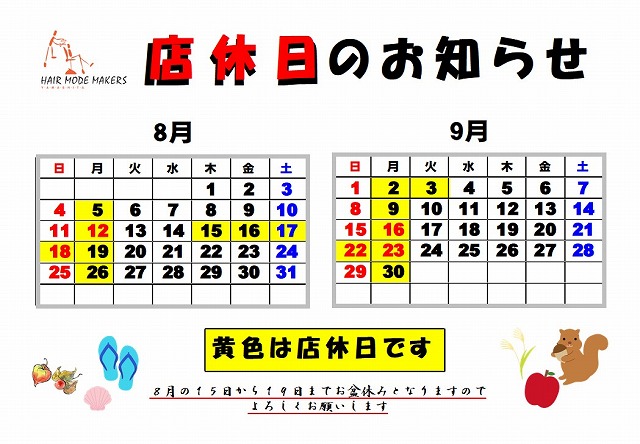 ヘアーモードメーカーズヤマシタの【8月の店休日のお知らせ】です。 2024-07-31 最終更新日時 : 2024-07-31 staff 毎日暑い日が続きますが、これからお盆に向け外での作業も増えるかと思いますが、熱中症には気を付けてお過ごしください。15日から5日間お盆休みとなりますのでよろしくお願いします